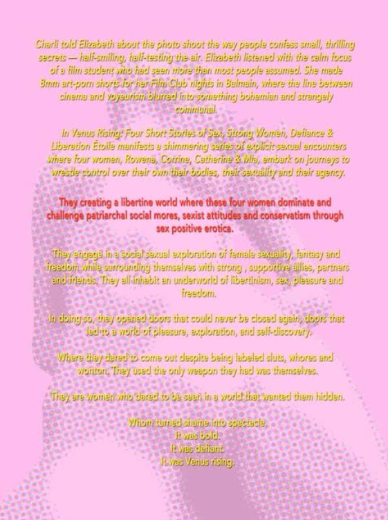 Venus Rising: Four Short Stories of Sex, Strong Women, Defiance & Liberation, are stories where Étoile conjures a shimmering series of explicit sexual encounters where four women, Rowena, Corrine, Catherine & Mia, embark on journeys of self-discovery in order to wrestle control over their own their bodies, their sexuality and their agency. They enter a libertine world where women dominate and challenge patriarchal social mores, sexist attitudes and conservatism through sex positive feminist erotica film and performance.